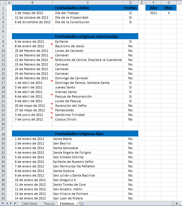 Festivos hemos agrupado las festividades en tres bloques: el primero, contiene las festividades oficiales; el segundo, las festividades que dependen de la Pascua de Resurrección; el tercero, contiene las festividades religiosas fijas. Algunos días pueden coincidir en dos bloques, pero al colocarlos en el orden mencionado, la función BUSCARV (que emplearemos más adelante) elegirá siempre la festividad que esté en el primero de los bloques. Por otra parte, en la columna